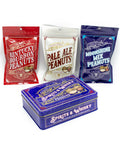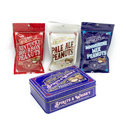 Indulge in a trio of bold, spirit-inspired flavors with our Spirits & Whisky Peanuts Men's Gift Tin. This 12 oz. blue tin features three 4 oz. bags of hand-roasted peanuts, each seasoned with unique beer, moonshine, and bourbon-inspired recipes.